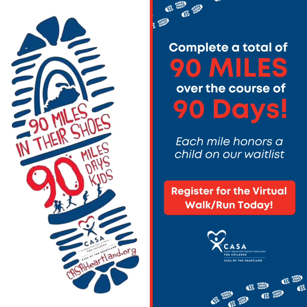 This is more than just a virtual event. It’s an opportunity to raise awareness and vital funds to help CASA of the Heartland recruit, train, and support volunteer advocates for abused and neglected children in Hardin, Breckinridge, Grayson, LaRue, and Meade counties. Complete your miles at your own pace and in your own time—whether that’s a mile a day or a few longer outings each week.