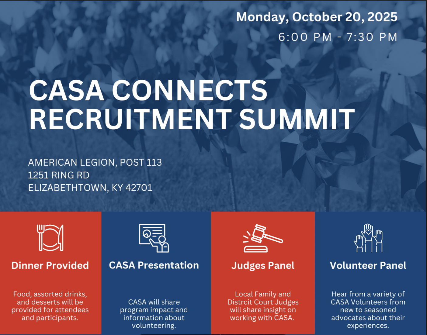 Enjoy a casual dinner as you hear from local judges who work closely with CASA, as well as a panel of current volunteers sharing their personal experiences. You will also learn about the training process, time commitment, and the difference one advocate can make in a child’s life.
